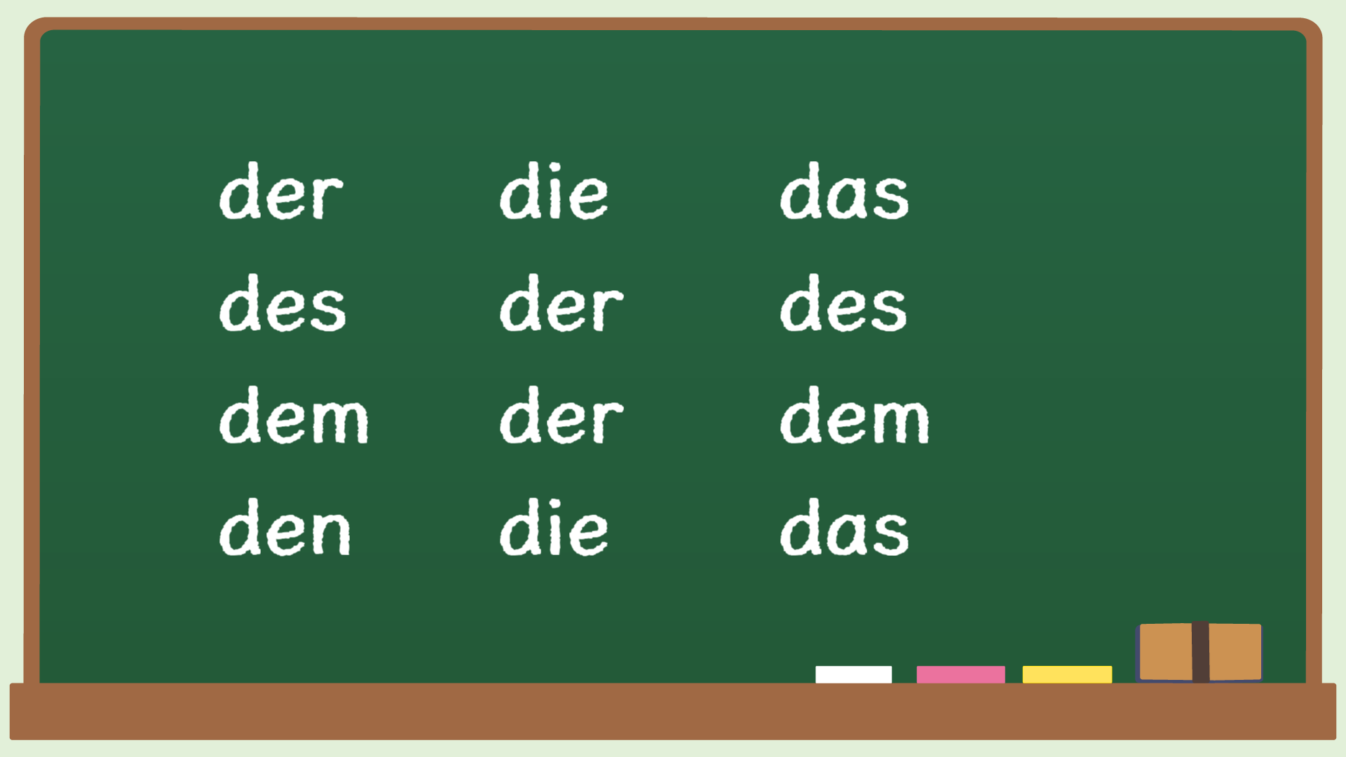 これも覚えてしまって下さいね。定冠詞のであ・です・でむ・でん、がわかっていたら、大体見当が付くでしょ?