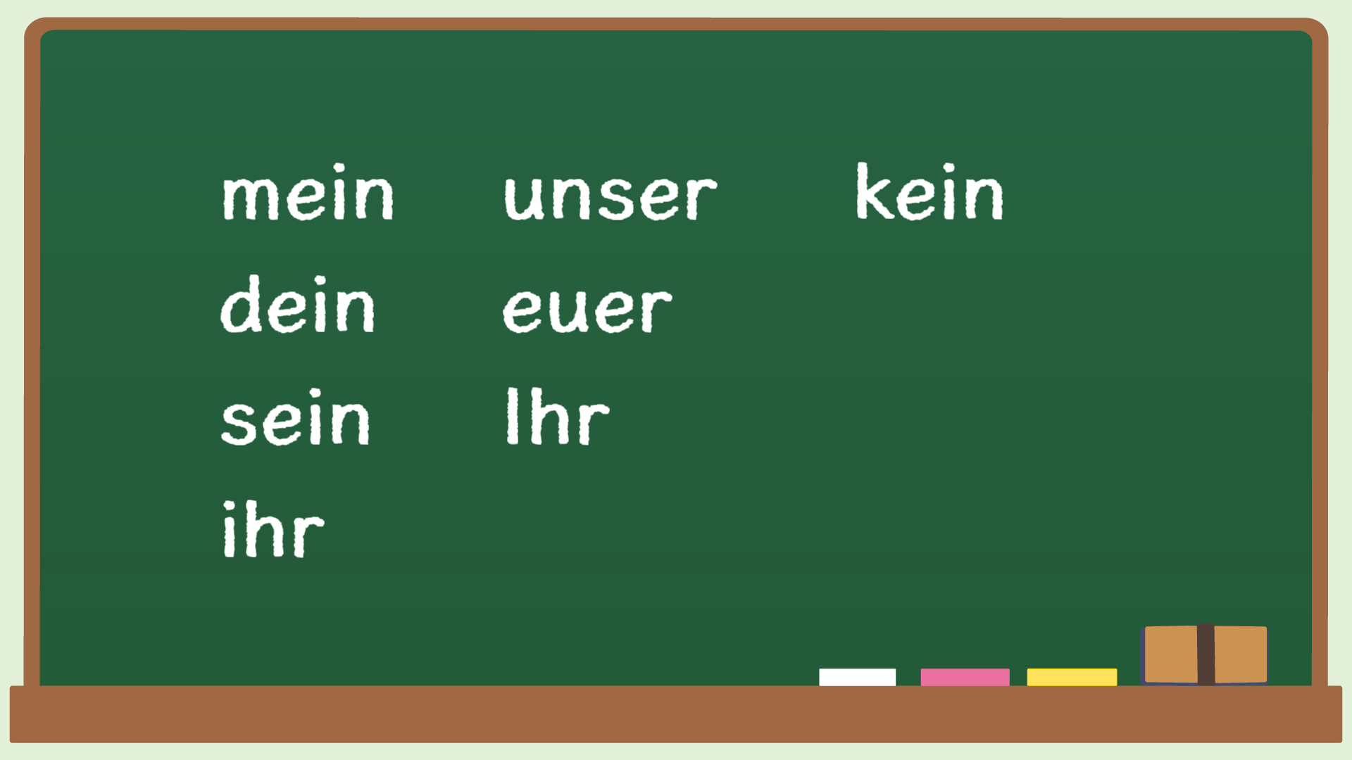 | 単数 | mein(私の) | dein(君の) | sein(彼の、それの) ihr(彼女の) | Ihr(あなたの、あなたたちの) | |