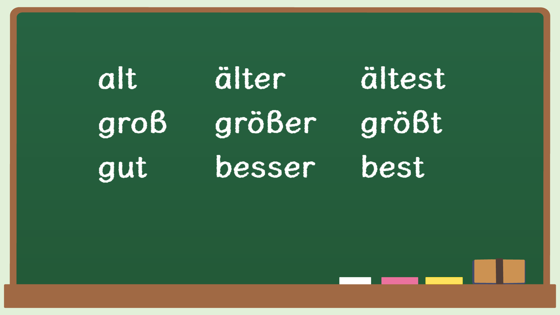 ドイツ語でも、英語と同じように、形容詞に語尾をつけて、比較級、最高級を作ります。原則として、比較級では、er を、最上級では、st をつけます。